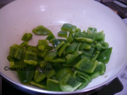 - Then in the same kadai add a tsp of oil and fry capsicum and until glossy and slightly colored for 3-4 minutes,take away in a bowl.