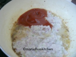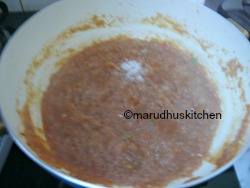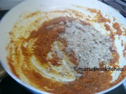 3.Again in the same kadai add oil and heat up add cumin then the onion paste immediately add tomato puree and then salt.4.saute nicely till forms a mass then add the nuts powder and mix.