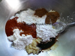 - Take a vessel and add maida,cornflour,red-chilli paste,soya sauce,ajinomoto,ginger garlic paste,cumin and garam masala powder and add vinegar to it.