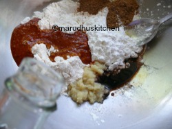 3.Take a vessel and add maida,cornflour,redchilli paste,soya sauce,ginger garlic paste,ajinomoto,cumin and garam masala powder and add vinegar to it.