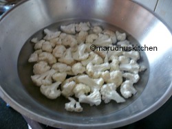 2.Boil water in a vessel and add florets of cauliflower to it with two pinches of salt and leave for two minutes and strain it off separately and keep.