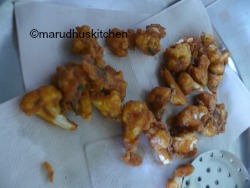 - Keep oil in a kadai and when hot dip florets in batter fry and when light brown take it out.