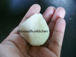 7.Now take a ball press down the corners and in the middle evenly and place a small ball of filling and join dough together so that it tappers at the end.