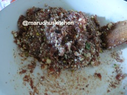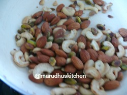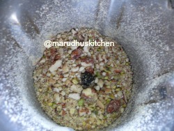 1.Fry all nuts in little ghee till golden and powder coarsely.