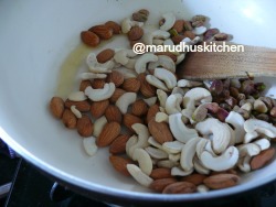 - Fry all nuts in little ghee till golden and powder coarsely.