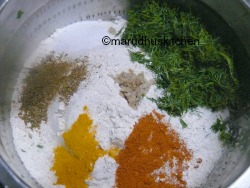 - Take a broad vessel add wheat flour,salt,chilli powder,turmeric powder,jeera powder and grated ginger.