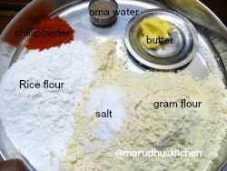 - Take gram flour,rice flour,salt,chilli powder,omam water and butter in a large plate and form a dough till smooth by adding water.