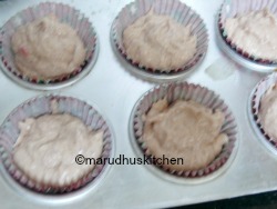 1.Take a mixer jar puree strawberries with milk ,vanilla essence and keep ready and line the cupcake or muffin tray with paper cups.