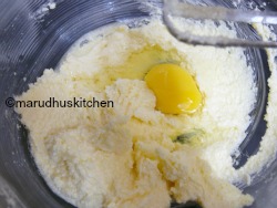 4.Now reduce speed and add egg one after other,beat well till nicely combined.