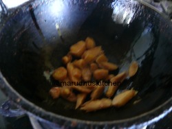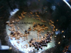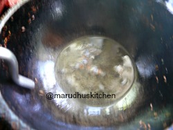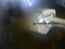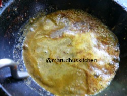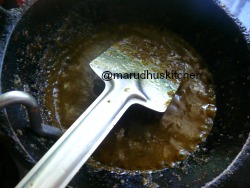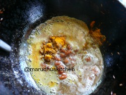 - Now heat a kadai with remaining oil and add mustard seeds and when it splutters add coriander powder,turmeric powder,jaggery and then the mixture .when it is boiling add salt.
