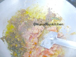 11.When oil oozes add tomatoes and saute well.