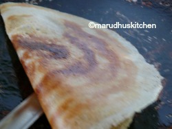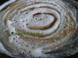 - Heat dosa pan,when heated bring down the heat by sprinkling water and bring down the flame to medium high heat then rub clean with oil smearing cloth.