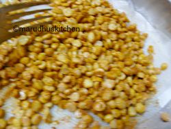 5.Fry in batches till the “shh”sound subsides take out in a tissue then mix up with spice powders when it is still hot so that all masalas sticks to it.