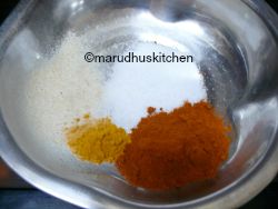 - Then keep ready with a mix of chilli,turmeric,hing,chat masala powders and salt.