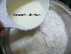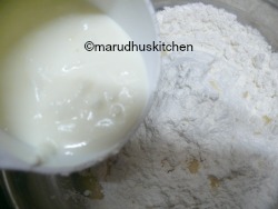 - Take maida in a bowl add salt,soda and oil mixture to it.