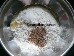 1.In a bowl add maida with salt,oil and ajwain form a dough by adding water.