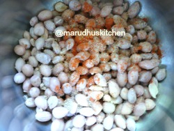 - Take the peanuts in a bowl add salt,cumin powder,chilli-powder and chat-masala.