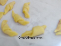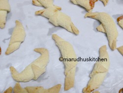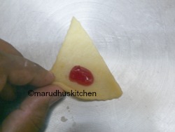This is one among the rare cookie variations that has soft melting texture with the jam stuffed insides giving all the sweetness and this is the part which makes this short bread kind of biscuit very catchy and seductive.The cookie after its baked immediately should be rolled in the bed of powdered sugar so that it sticks well and coats the cookie.The cookie dough should be kneaded for some time to make it pliable and thus can be easily rolled out and cut! they are cut into triangles and the jam should be kept at the broad end and rolled out sealing the sides.After rolling it can be lifted upwards to give a specific shape or can be left as such and baked.For me it took twenty minutes to cook but as I would always say the oven timing always differs.
