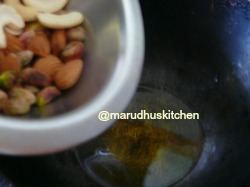 - In a kadai add ghee and roast the nuts.