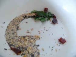 - Now keep a kadai add some oil mustard and when it crackles add urad,red chillies,curry leaves and bengal gram.
