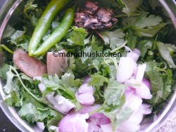 - Grind coriander,greenchillies,ginger,tamarind and small onions to a paste by adding water.