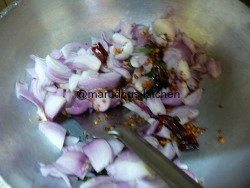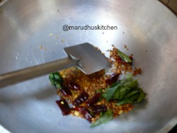 - Keep kadai add oil and add mustard urad dhal and channa dhal and leave till golden,add curry leaves.