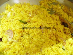 - Next add rice to it and mix thoroughly and keep in low flame for some time and stir now and then for 5 minutes till raw smell goes and switch off.