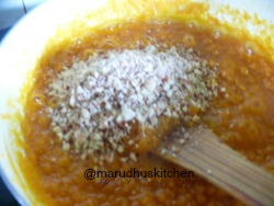 6.Now add the syrup to the carrot mixture and let it boil.Then cook the mixture nicely by closing the lid and stirring then and their as it splutter’s out.when it is slightly thick add the almond-cashew powder.