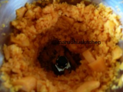 1.Grind carrot and milk powder without water then take a kadai add tbsp ghee and add the ground carrot and milk powder mix .