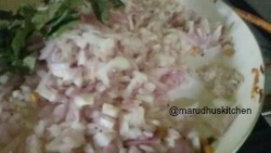 - Add urad,bengal gram dhal when it browns add onion ,asafoetida,green-chilli and curry leaves.