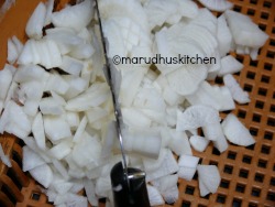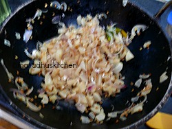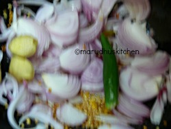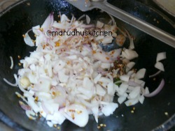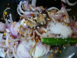 1.First add oil in a kadai when it heats up add urad dhal kadalaparuppu and when it is brown add onions,chilli and ginger.