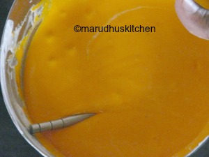 5.After it dissolves keep the flame low and check till it reaches a half string stage at this stage the sugar will become little thick and it may take 5-6 minutes.