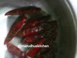 - First soak chillies for 15 minutes and keep ready and also the tamarind extract.