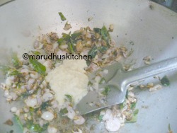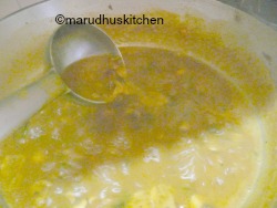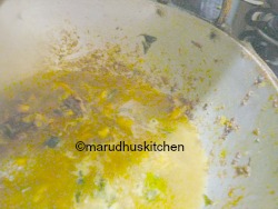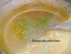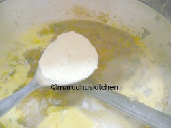 12.When it starts boiling sprinkle roasted gram dal powder little by little,stir it without any lumps(let it boil for some time,check for salt ,if needed add).