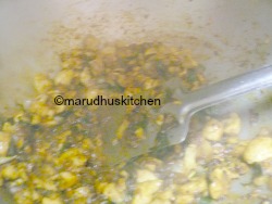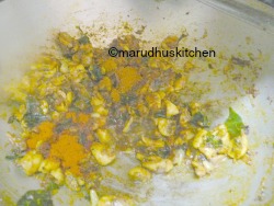 10.When mushroom shrinks add chilli powder and garam masala and stir till rawness goes off.