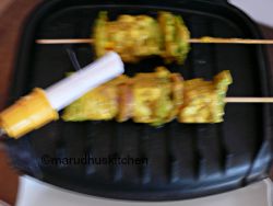 The vegetable you are using should be cut of same size for even cooking and grilling!mostly for grilling kebabs they are cut into cubes.The onions are separated into segments as cubes and for capsicum the very same way.Marinating the vegetables for some time leaves the kebab to taste awesome!You can very well fry some kasuri methi and crush them before adding it to the marinate for great flavour enhancement.As I had only green coloured capsicum in hand I have used it you can very well use yellow and red capsicum for attractive colour combinations.I have an electrical griller so I did with it if you don’t have one use a simple dosa pan drizzle some oil and cook on all the sides with constant turning when cooked.