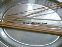 - Soak wooden skewers in water for 20 minutes.