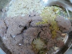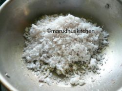 6.In same ghee roast coconut nicely and add this to poha with nuts,elachi and mix to form a dough by adding jaggery syrup.