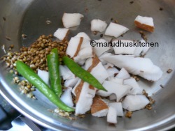 2.Keep a kadai add oil then add urad dhal,cumin,jeera and saute till golden switch off add coconut and chillies.