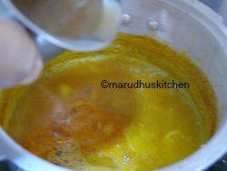 6.Now add the extract and boil till the rawness of tamarind subsides.