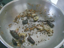 2.Keep a kadai add oil when oil heats up add mustard,fenugreek,jeera ,urad and Bengal gram dhal.