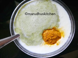 - Take well beaten buttermilk and mix green-chilli mixture and turmeric and keep ready.