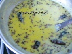 1.Take well beaten buttermilk and mix green-chilli mixture and turmeric and keep ready.