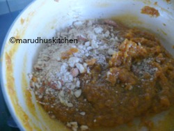 4.Let it boil and form a mass leaving the sides now add badam cashew mixture stir continuously till the content leaves the pan .