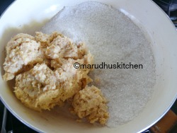 1.Take a nonstick kadai add khoa and sugar and bring to heat, the sugar will melt and will start to boil.