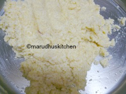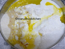 1.Take all the ingredients listed for the cake in a bowl add melted butter(add saffron to melted butter itself) and mix it to form a dough.