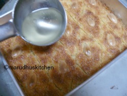 8.Pour the cooled syrup over it(the cake should be nicely hot when pouring).