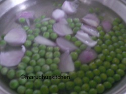 1.Boil 2 cups of water in a pan and add peas,onion to it and let it boil for 5-8 minutes.