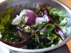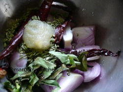 - Add chopped vegetable, onions,red chilles,sombu,curryleaves,asafoetida and salt to mixer and grind.