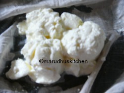- Take curd in a muslin cloth tie it to some hanging available in kitchen so that all the water drains out.